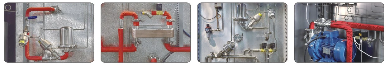 ● 304 stainless steel sanitary pipe, karo clampjoints. Ngadopsi katup pneumatik kursi sudut GEMU sing diimpor saka Jerman, katup solenoid sing disedhiyakake dening AirTAC Taiwan lan pompa vakum cincin banyu sing langsung diimpor saka SPECK Jerman.